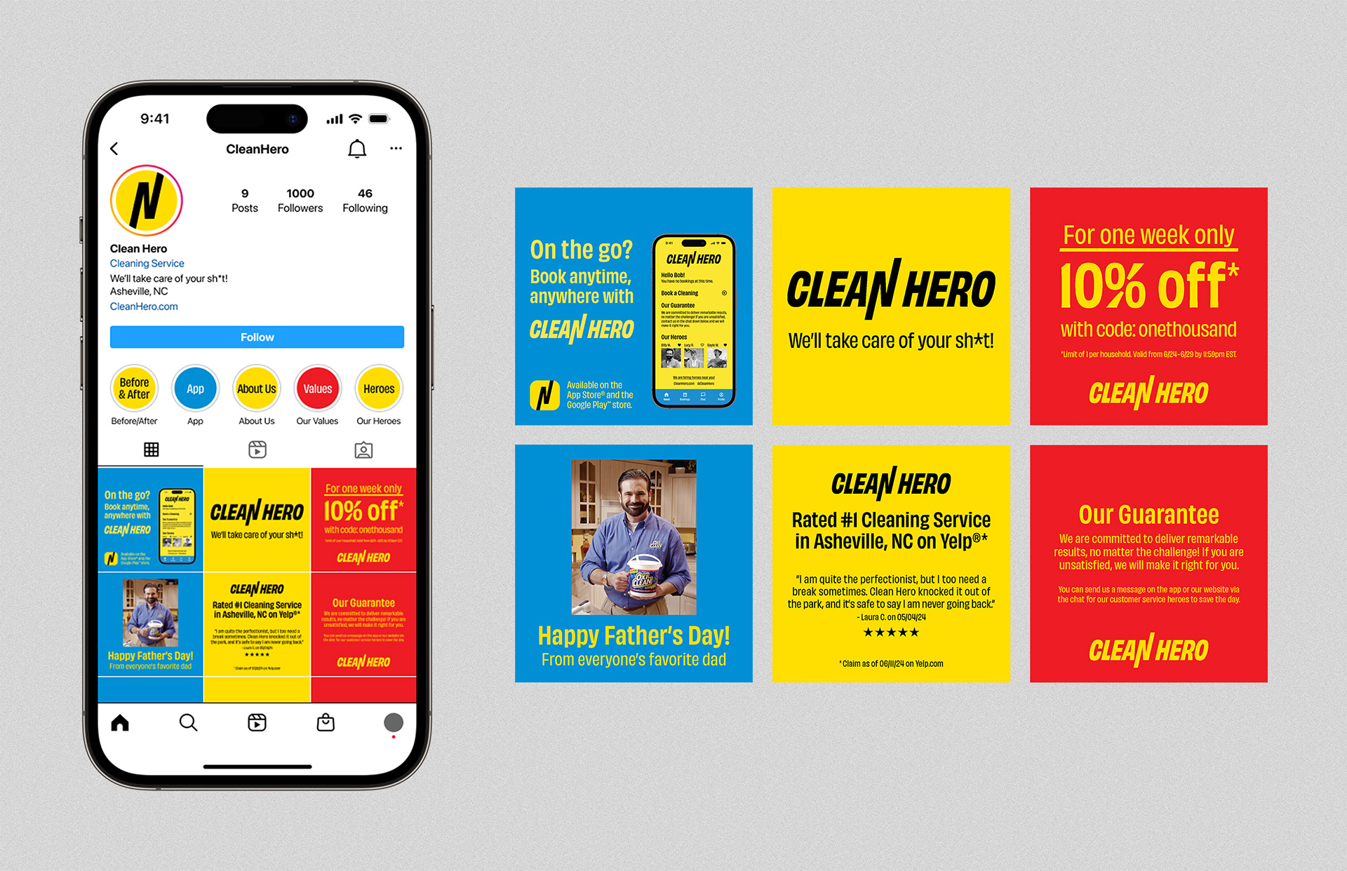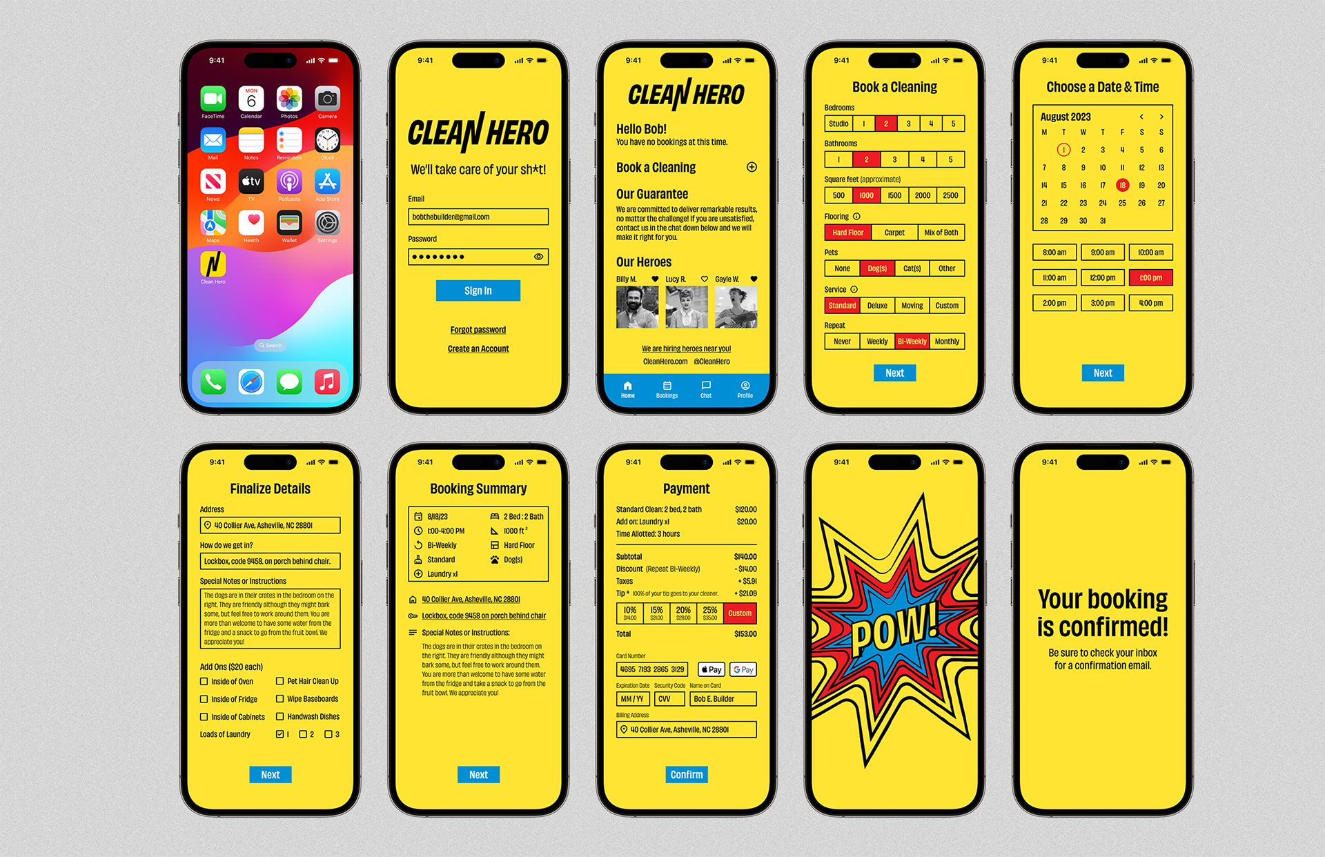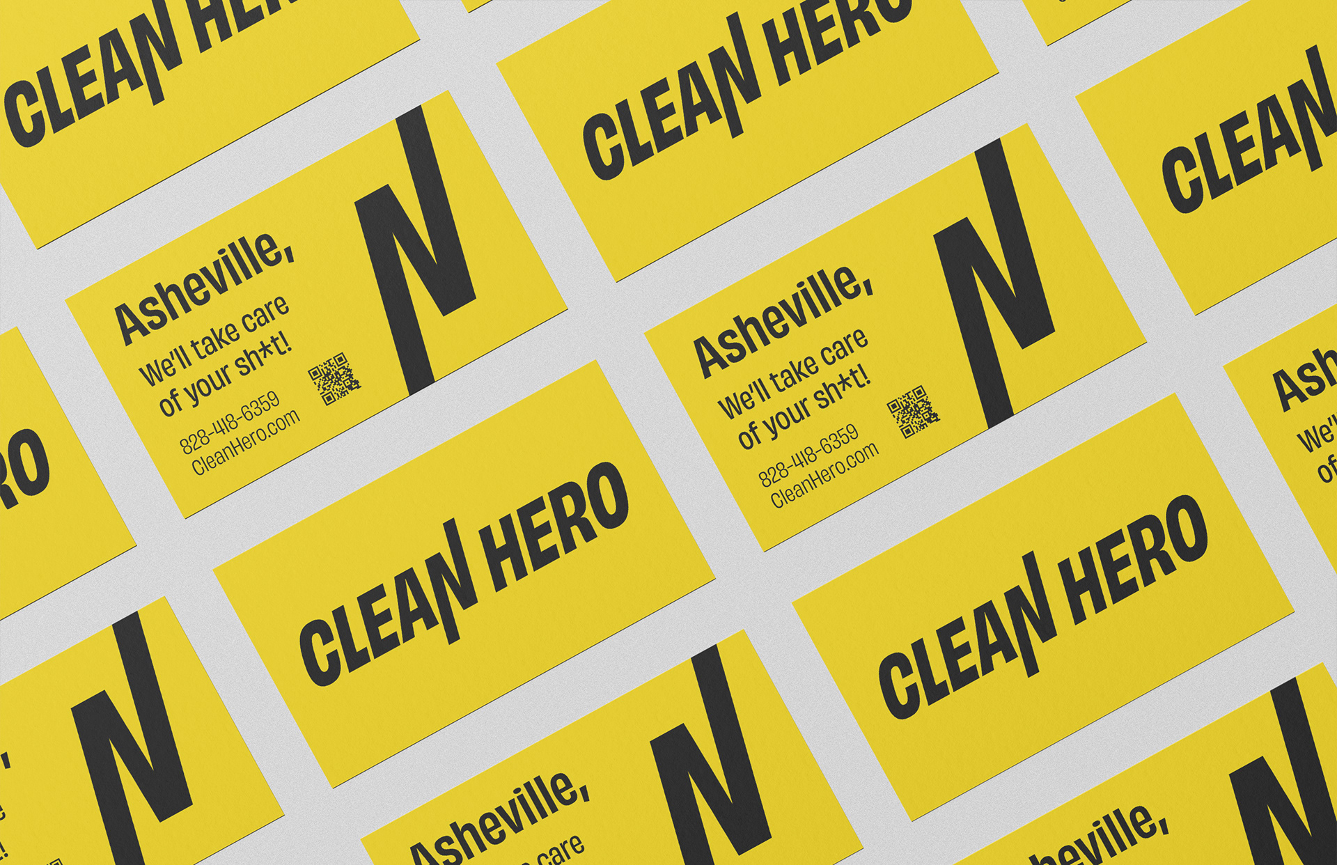 A home cleaners startup in Asheville, North Carolina. Clean Hero is a fun, nostalgic brand concept featuring pop culture references and a cheeky tone of voice. Using bold and vibrant elements, it draws the eye of prospective customers with just a quick glance. Its identity is unique and memorable by standing out from its competitors as well as other companies.