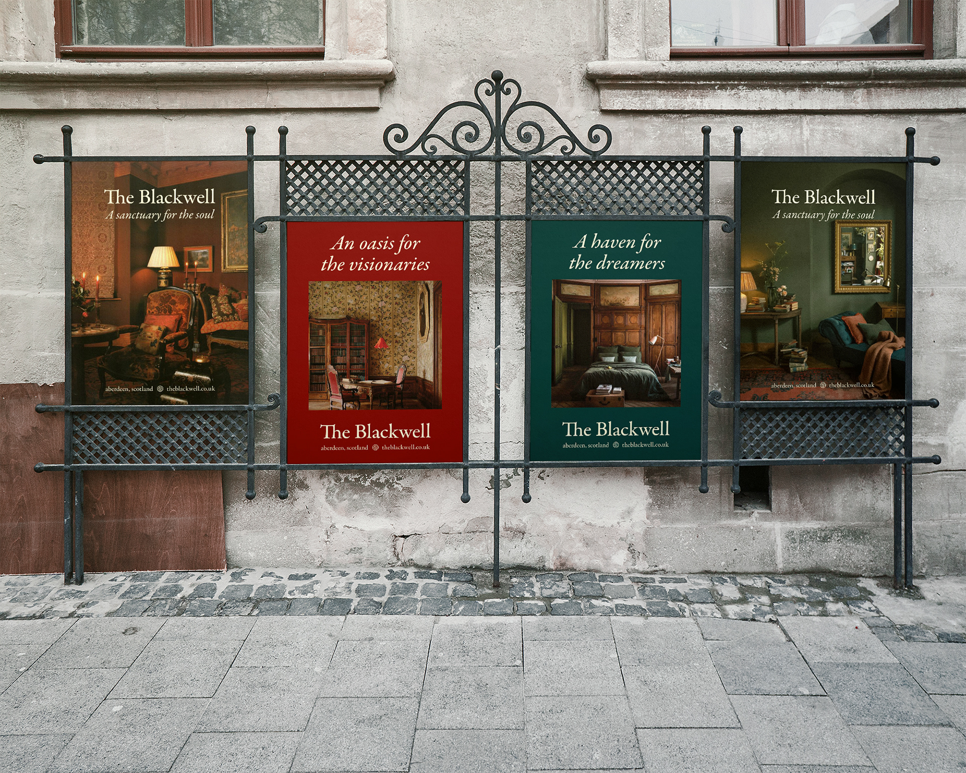 A boutique hotel for artist residencies in Aberdeen, Scotland. The Blackwell is a historic and expressive escape from modernity. The surname “Blackwell” of English origin means "dark stream of water". The hotel overlooks the North Sea, known to have rough surf and water so dark you cannot see through it. The interior is visually inspired by maximalist architecture, such as the Victorian Era.